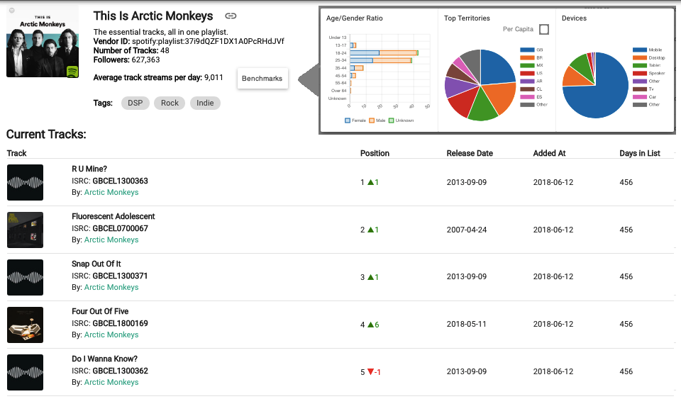 As in all data analytics, these benchmarks are built on a clear understanding of what billions of lines of data say. These benchmarks answer questions like how many engaged fans does an artist need to meet a release goal or to catch the ear of a key curator; how is marketing spend actually impacting listening and engagement; and what playlists will help an act get where it needs to go. Benchmarks identify similar artists to compare performance with. They add nuance and real insights to basic numbers like followers, streams, and skips.
